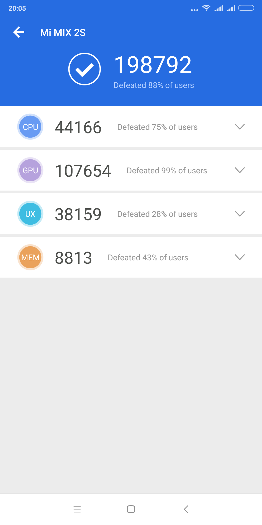 Jako další následovat benchmark AnTuTu, který se orientuje především na herní výkon. S ohledem na nižší rozlišení obrazovky, a tedy i nutnost obsloužit méně obrazových bodů jsme očekávali o něco lepší výsledek ve prospěch Mi Mix 2s, nicméně naměřili jsme 199 145 bodů, což naznačuje nějaký problém.