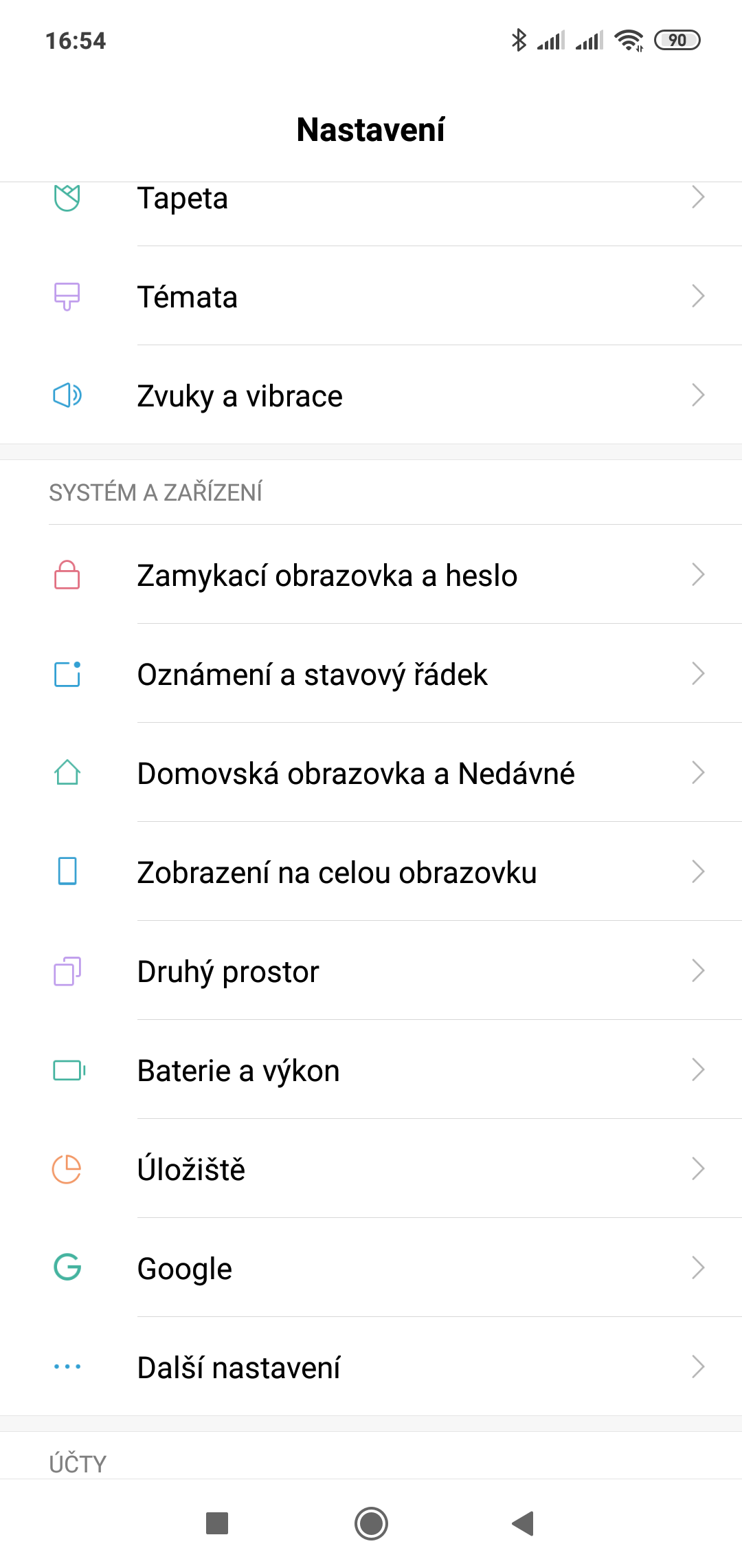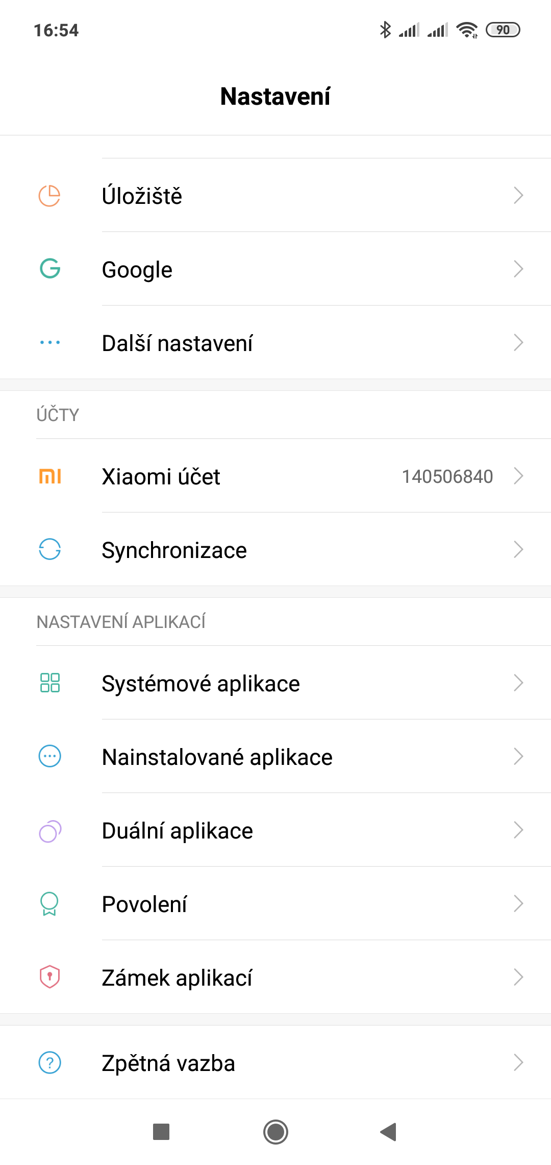 - Nastavení – systémové nastavení si Xiaomi upravilo podle svých představ. Je poměrně přehledné, jednotlivé sekce jsou odlišeny barevnými ikonami. Nechybí ani praktická možnost vyhledávání položek pomocí klíčových slov.