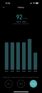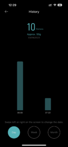 Díky všem těmto informacím vám aplikace následně navrhne ideální denní dávkování, které si můžete buďto upravit dle vlastních preferencí nebo je jednoduše akceptovat a rozdělit na jednotlivé dávky v různých časových intervalech. Aplikace je bohužel v angličtině a tak i mě chvíli trvalo, než jsem pochopil její systém dávkování. Dávkování se totiž uvádí v tzv. „portions„, čili v překladu „porcích„. Jenže v jedné dávce můžete mít třeba osm těchto porcí a to mě zprvu trochu mátlo. Až po čase jsem si uvědomil, že zde uváděná jedna porce se rovná jedné komoře dávkovače. Takže to není o porcích jako takových, ale spíše o otočkách, které pro vydání dávky musí přídělový mechanismus udělat. Sice hned pod počtem „porcí“ vidíte i přibližnou gramáž, ale myslím, že kdyby porce zmizely a byla uvedena právě jen gramáž v dané dávce, bylo by to vše přehlednější.
