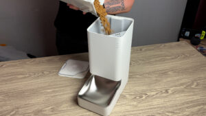 Zásobník krmiva je ukryt uvnitř celého zařízení a je přístupný skrze mechanicky zajištěné vrchní víko a je vyjímatelný. Stačí tedy stisknout aretační tlačítko a víko se uvolní a zásobník můžete ze zařízení vytáhnout. Zásobník krmiva je vyroben z měkčího šedého plastu, který svými vlastnostmi odpovídá materiálům přicházejících do styku s potravinami. Zásobník je snadno omyvatelný a jelikož pracuje se suchým krmivem, ani se na jeho povrchu neusazují žádné výraznější nečistoty. Jedná se spíše o miniaturní drobečky, až skoro prášek, který vzniká tím, jak se o sebe jednotlivé granule třou. O vyčištění si řekne jednou za deset dní skrze aplikaci, ale myslím, že se nic nestane, když čištění necháte až na chvíli, kdy v zásobníku dojde krmivo.