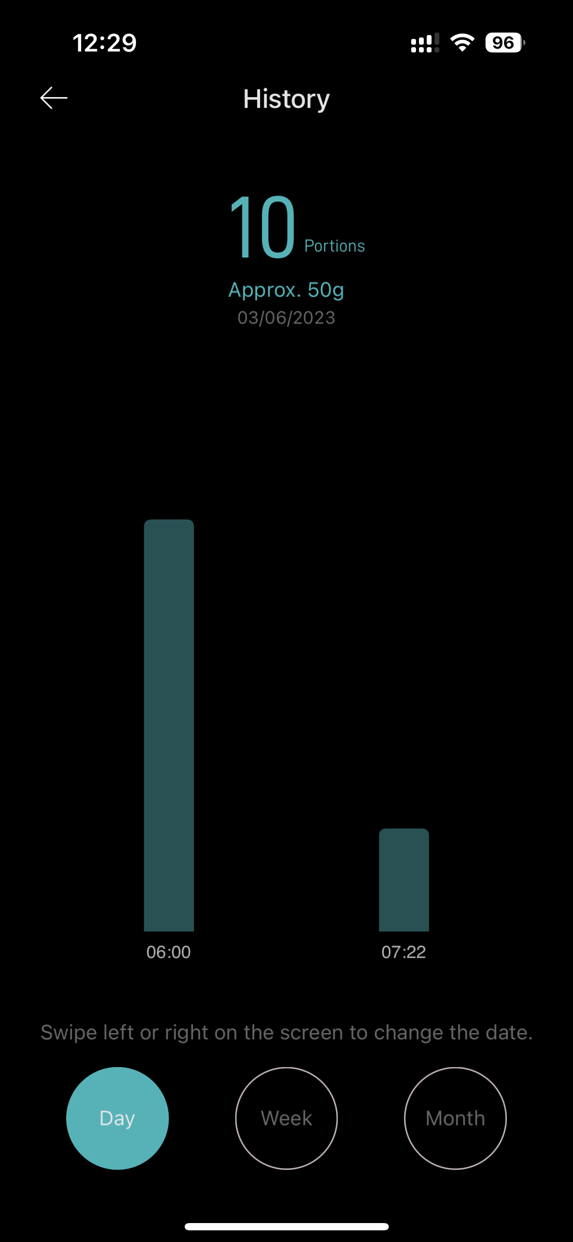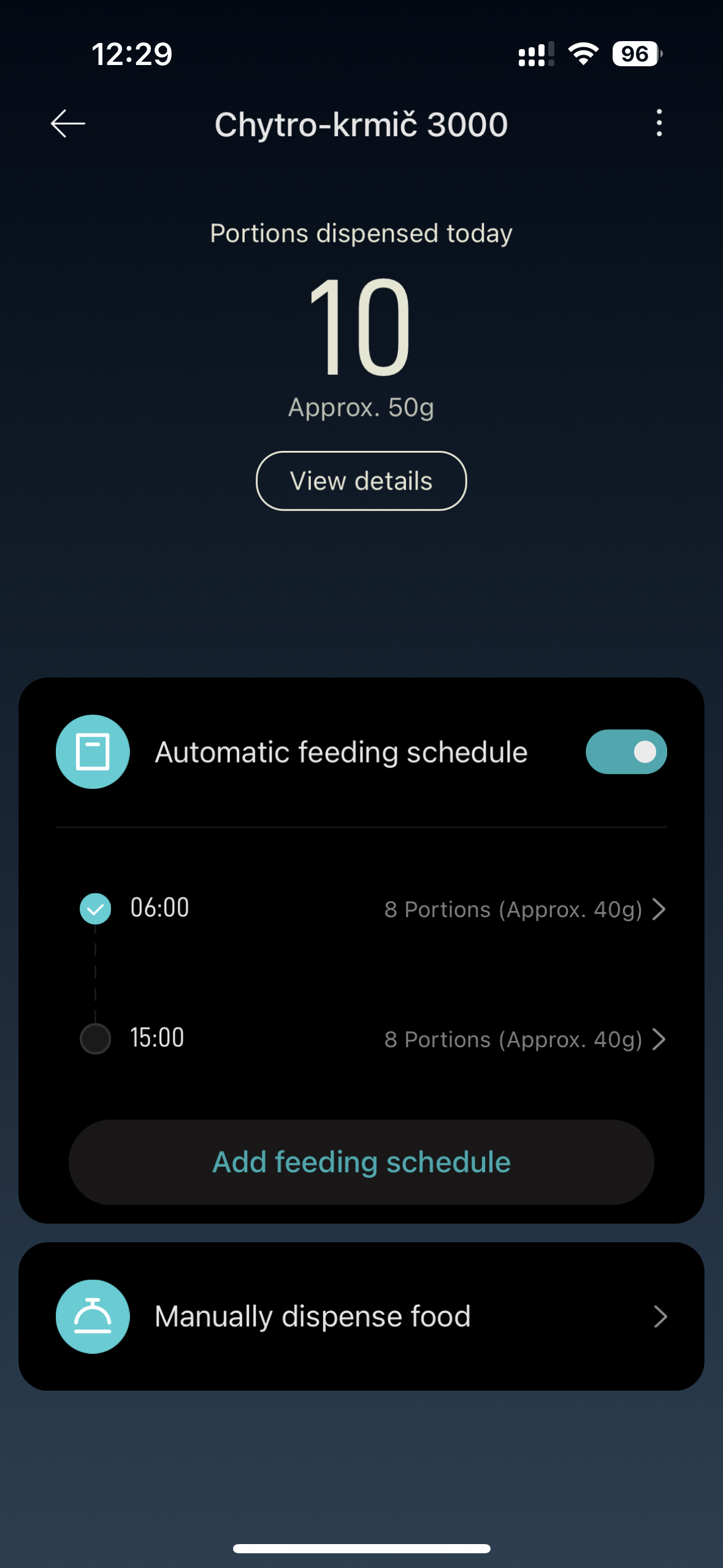 Na hlavní stránce chytrého dávkovače vidíte v horní části, kolik „porcí“ (včetně přepočtu na gramáž) bylo daný den již vydáno. Pod počítadlem naleznete i tlačítko pro zobrazení detailů, kde poté uvidíte jednotlivé dávky v průběhu dne, aktuálního týdne či měsíce. Dále na úvodní stránce uvidíte také rozvrh automatického dávkování a nakonec také tlačítko pro manuální vydání extra dávky. Množství granulí, které se vydává v takovéto extra dávce si můžete samozřejmě nastavit. Opět na počet oněch „porcí„.