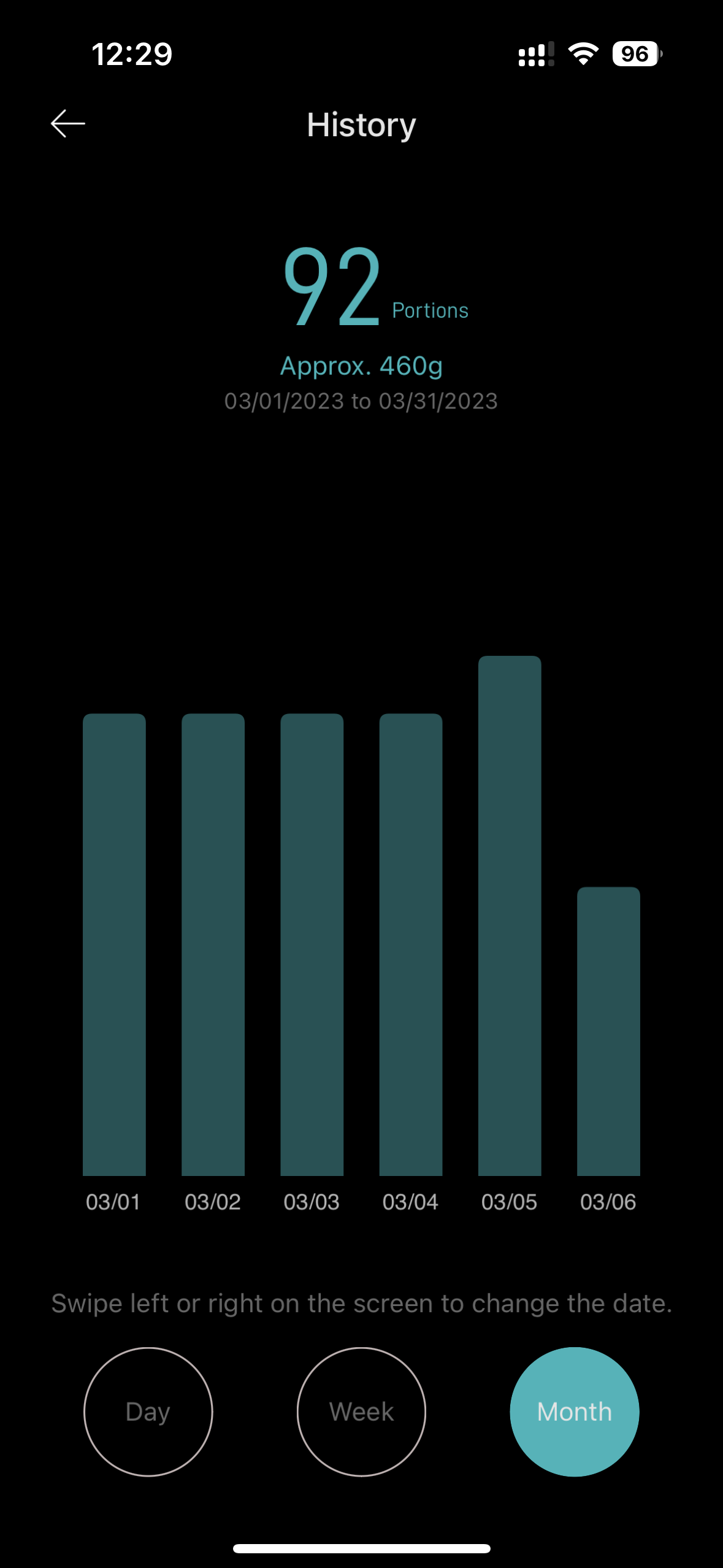 Díky všem těmto informacím vám aplikace následně navrhne ideální denní dávkování, které si můžete buďto upravit dle vlastních preferencí nebo je jednoduše akceptovat a rozdělit na jednotlivé dávky v různých časových intervalech. Aplikace je bohužel v angličtině a tak i mě chvíli trvalo, než jsem pochopil její systém dávkování. Dávkování se totiž uvádí v tzv. „portions„, čili v překladu „porcích„. Jenže v jedné dávce můžete mít třeba osm těchto porcí a to mě zprvu trochu mátlo. Až po čase jsem si uvědomil, že zde uváděná jedna porce se rovná jedné komoře dávkovače. Takže to není o porcích jako takových, ale spíše o otočkách, které pro vydání dávky musí přídělový mechanismus udělat. Sice hned pod počtem „porcí“ vidíte i přibližnou gramáž, ale myslím, že kdyby porce zmizely a byla uvedena právě jen gramáž v dané dávce, bylo by to vše přehlednější.