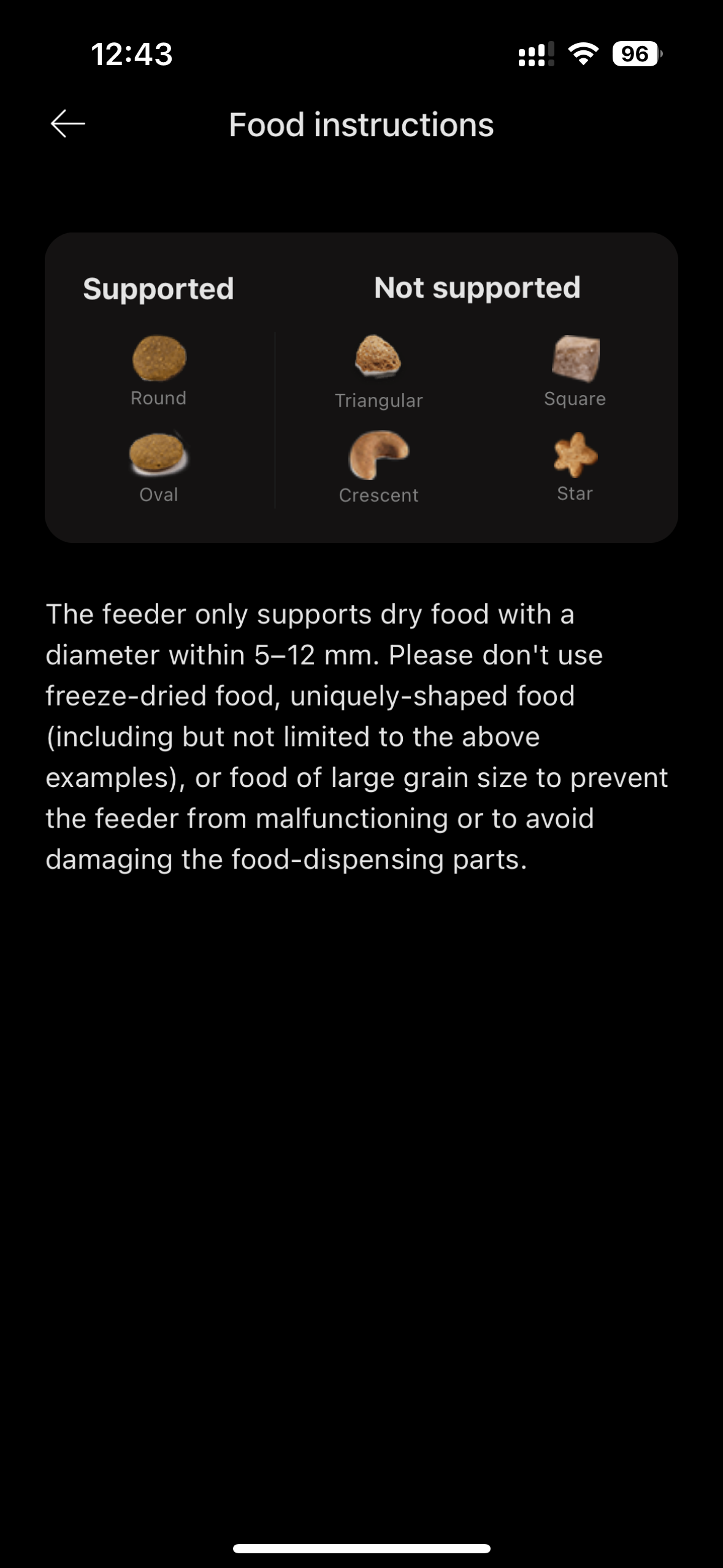 Granule by měly být buď kulaté nebo hranaté a jejich průměr by měl být 5 – 12 mm. Jakékoli jiné granule, tedy granule jiných tvarů či jiného průměru mohou způsobovat v lepším případě zasekávání zařízení, v horším jeho poškození. Nádoba zásobníku pojme až 1,8 kg granulí, což je množství, které by kočce či menšímu psovi mělo pohodlně vyjít na 15 – 20 dní pravidelného dávkování.