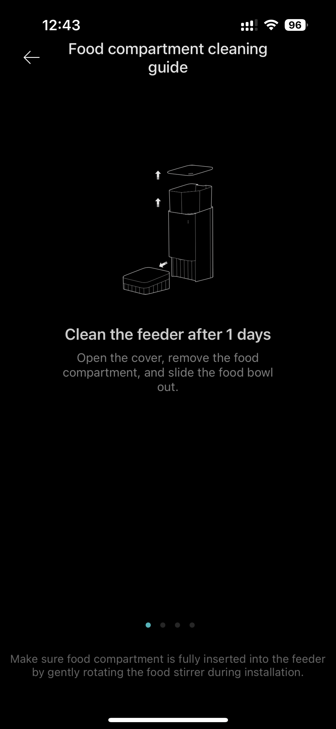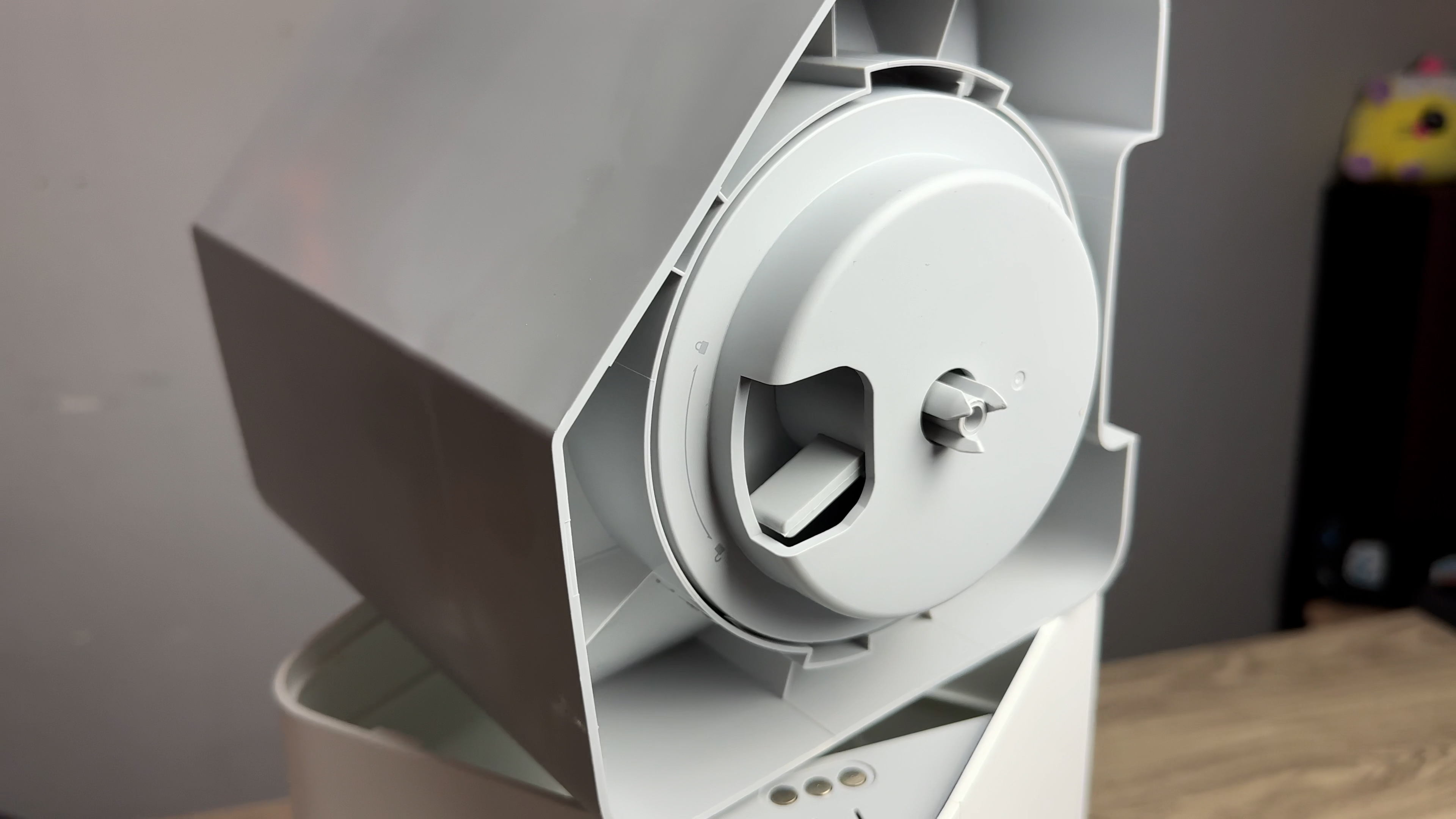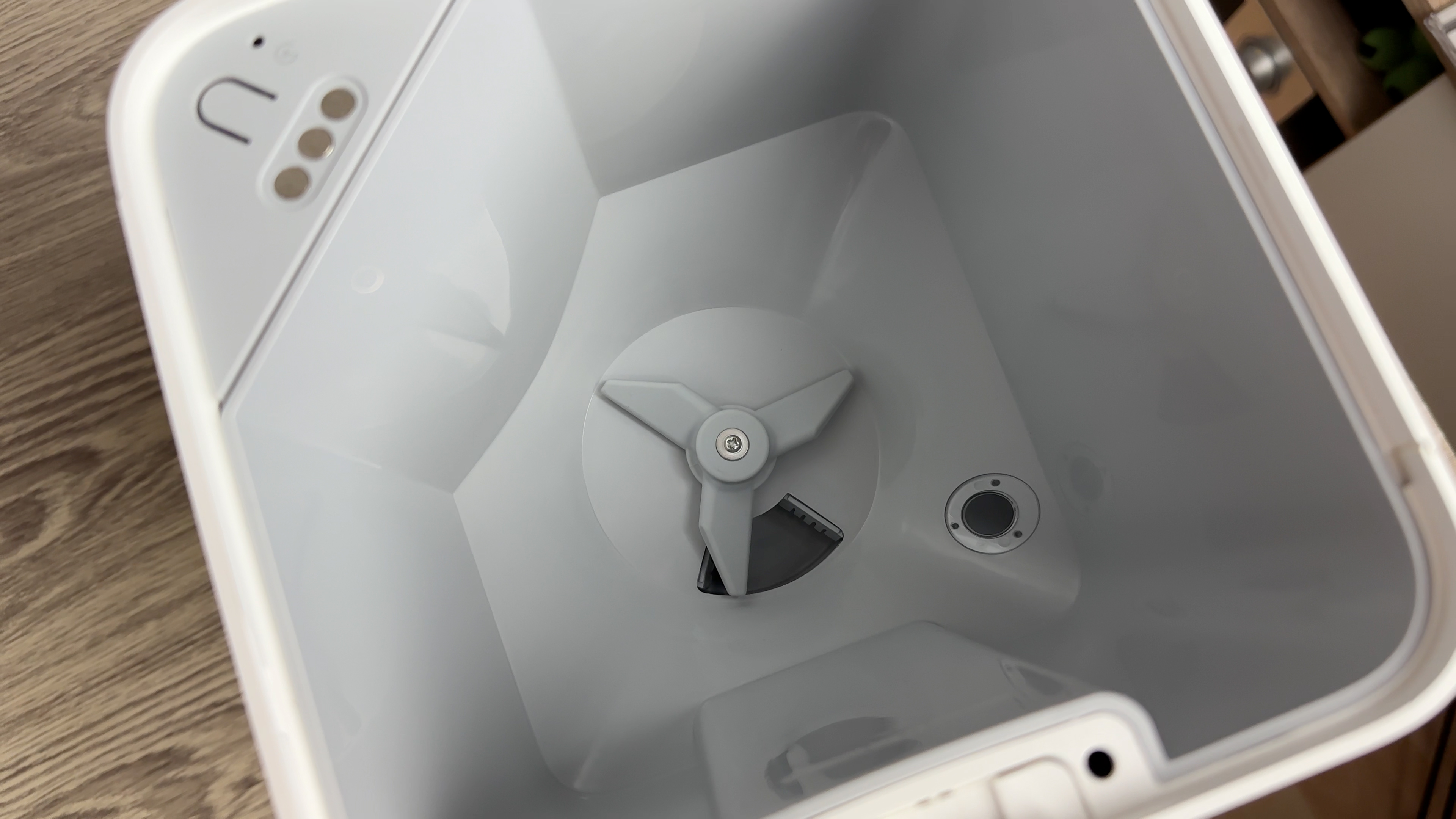 Zásobník krmiva je ukryt uvnitř celého zařízení a je přístupný skrze mechanicky zajištěné vrchní víko a je vyjímatelný. Stačí tedy stisknout aretační tlačítko a víko se uvolní a zásobník můžete ze zařízení vytáhnout. Zásobník krmiva je vyroben z měkčího šedého plastu, který svými vlastnostmi odpovídá materiálům přicházejících do styku s potravinami. Zásobník je snadno omyvatelný a jelikož pracuje se suchým krmivem, ani se na jeho povrchu neusazují žádné výraznější nečistoty. Jedná se spíše o miniaturní drobečky, až skoro prášek, který vzniká tím, jak se o sebe jednotlivé granule třou. O vyčištění si řekne jednou za deset dní skrze aplikaci, ale myslím, že se nic nestane, když čištění necháte až na chvíli, kdy v zásobníku dojde krmivo.