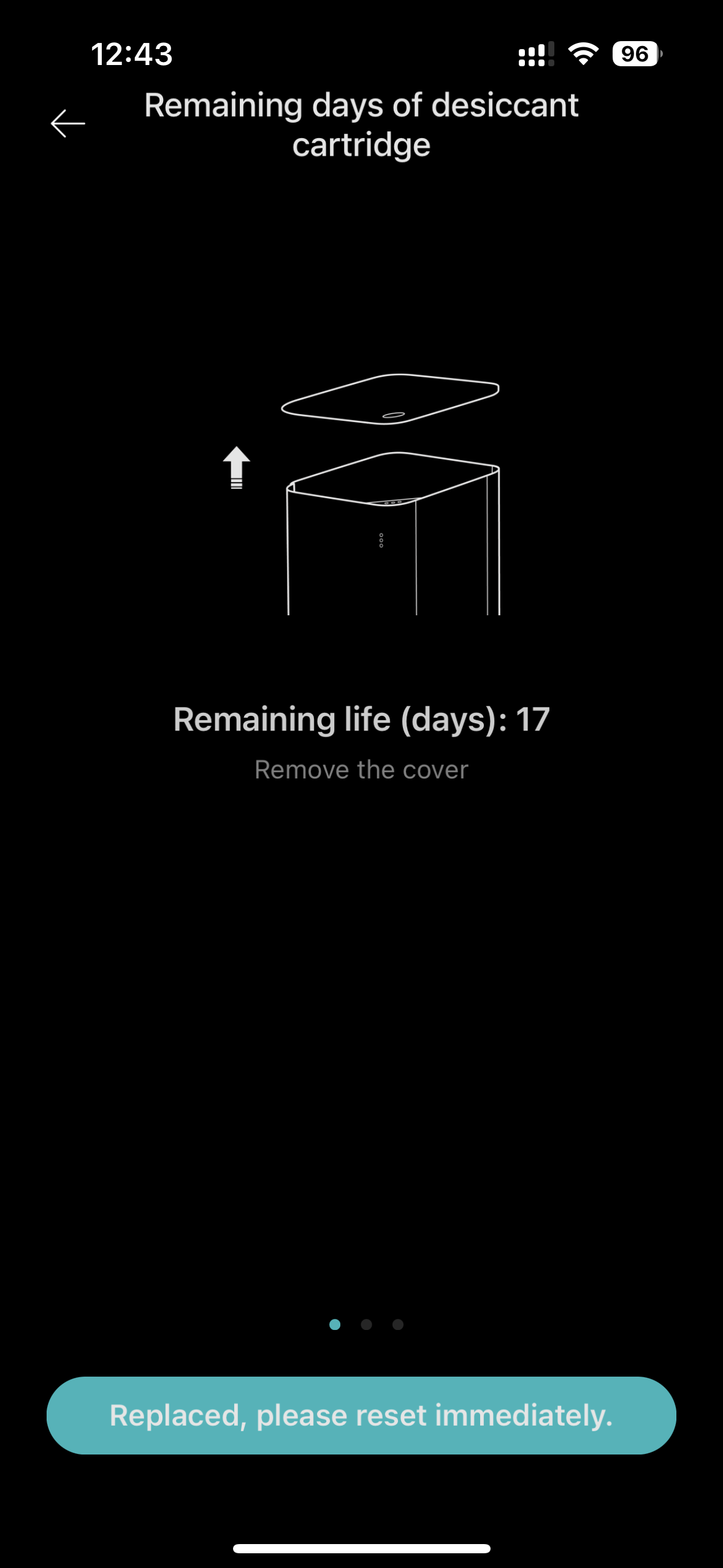 Navíc je zařízení vybaveno vysoušecí kazetou, která se umisťuje na vnitřní stranu víka. Ta je samozřejmě spotřební a jednoho času pojme tolik vlhkosti, že bude potřeba ji vyměnit, aby vysoušení fungovalo dále. Nicméně není drahá, stojí něco kolem dvou set korun. A vydržet by měla minimálně jeden měsíc v případě vystavení vysoké vlhkosti a až pět měsíců v případě opačného extrému. Nicméně, nevím zda aplikace vysloveně monitoruje stav kazety, ale jak si ještě řekneme později, v aplikaci je vidět odpočet do konce její životnosti. Bohužel, jsem si této položky v aplikaci všiml teprve nedávno, takže nevím s jakým počtem dní startovala, ale pokud správně počítám, odpočet odpovídá 50 dnům životnosti. Po diskusi s dalšími uživateli podobných zařízení jsem ale přesvědčen, že pokud nebude kazeta vystavena opravdu vysoké vlhkosti, jaká je například v koupelnách nebo venkovních terasách v chladném období, měla by vydržet dva měsíce bez problémů, pravděpodobně i tři.