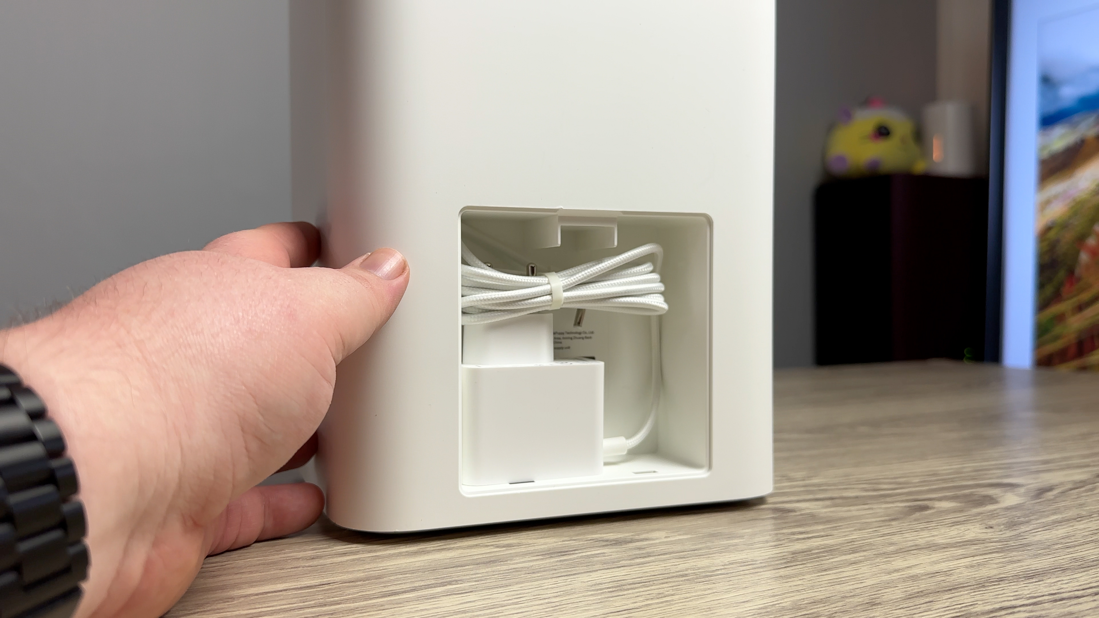 Na zadní straně ve spodní části najdete víčko, pod nímž byl ukrytý zabalený napájecí adaptér. A právě po tímto víčkem je i konektor pro jeho připojení. Stejně tak skryté je i záložní napájení v podobě čtyř AA baterií, které je určeno pro případy, že vypadne elektrický proud. To se nachází vespodu dávkovače. Na první pohled zde sice není vidět žádný otevírací mechanismus, ale když si všimnete nápisu OPEN a šipky, dojde vám, že když povolíte šroubek a tímto směrem zatlačíte spodní kryt, otevře se vám tajemná komnata záložního zdroje.
