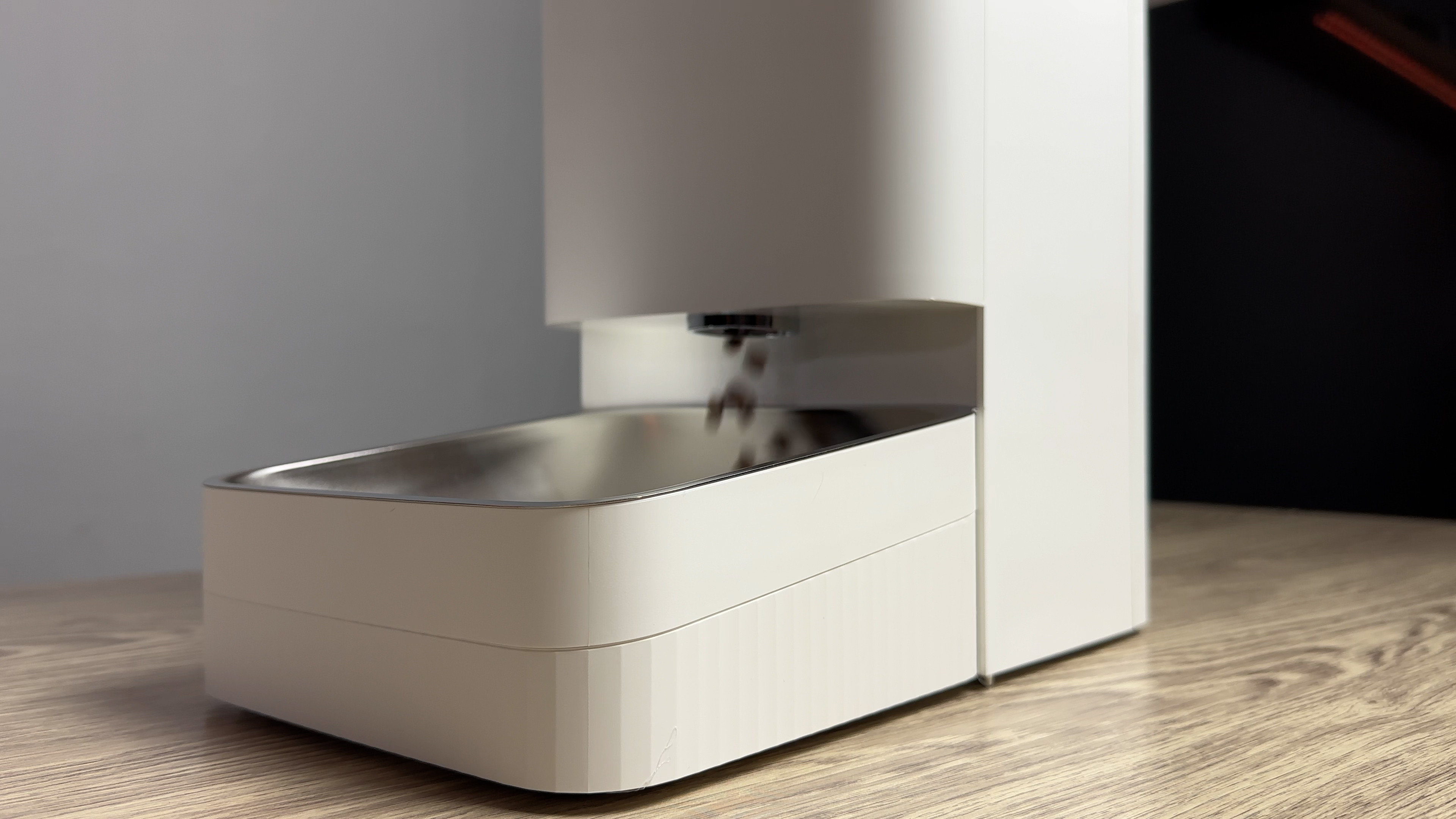 Nerezová miska se do plastového podstavce vkládá jednoduše a bohužel není nijak zajištěna. Prostě se položí na podstavec a drží gravitací. Samotný celek misky s podstavce se pak k dávkovači samotnému přichytává magneticky. Stačí se s miskou přiblížit a „cvak„, dojde k naprosto přesnému zapadnutí na místo. Magnet je dostatečně silný, takže díky tomuto zajištění nehrozí, že by kocour misku odstrkal od dávkovače při některém ze svých akčních náletů.