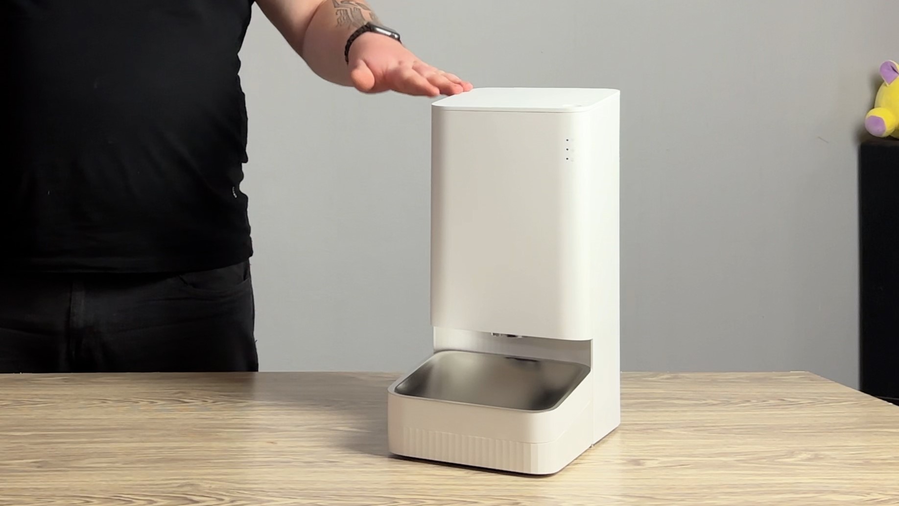 Tělo dávkovače je opět vyrobeno z tvrdého bílého plastu. Na horní straně se nachází víko zásobníku granulí, které je mechanicky zajištěno proti neúmyslnému otevření. To disponuje tlačítkem pro mimořádnou dávku granulí. Na čelí stěně v horním pravém rohu se nachází trojice LED, které indikují různé stavy zařízení. Najdeme tak zde kontrolku signalizující připojení k WiFi, kontrolku signalizující výdej nebo problémy s ním a kontrolku indikující docházející stav krmiva.