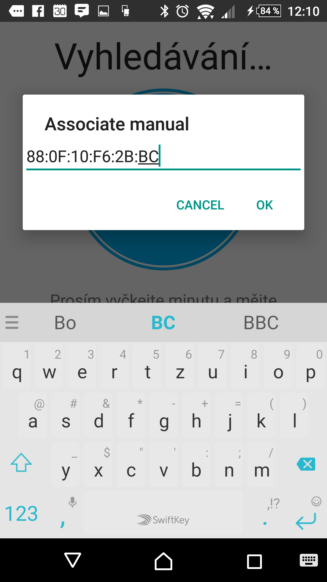 Po instalaci aplikaci spusťte a pokuste se připojit k náramku. S největší pravděpodobností se zobrazí hlášení o tom, že spojení selhalo (v opačném případě by mělo být připojení v pořádku). V takovém případě dostanete možnost připojit zařízení Bluetooth se specifickou MAC adresou – jedná se o tlačítko Spojit manuálně.