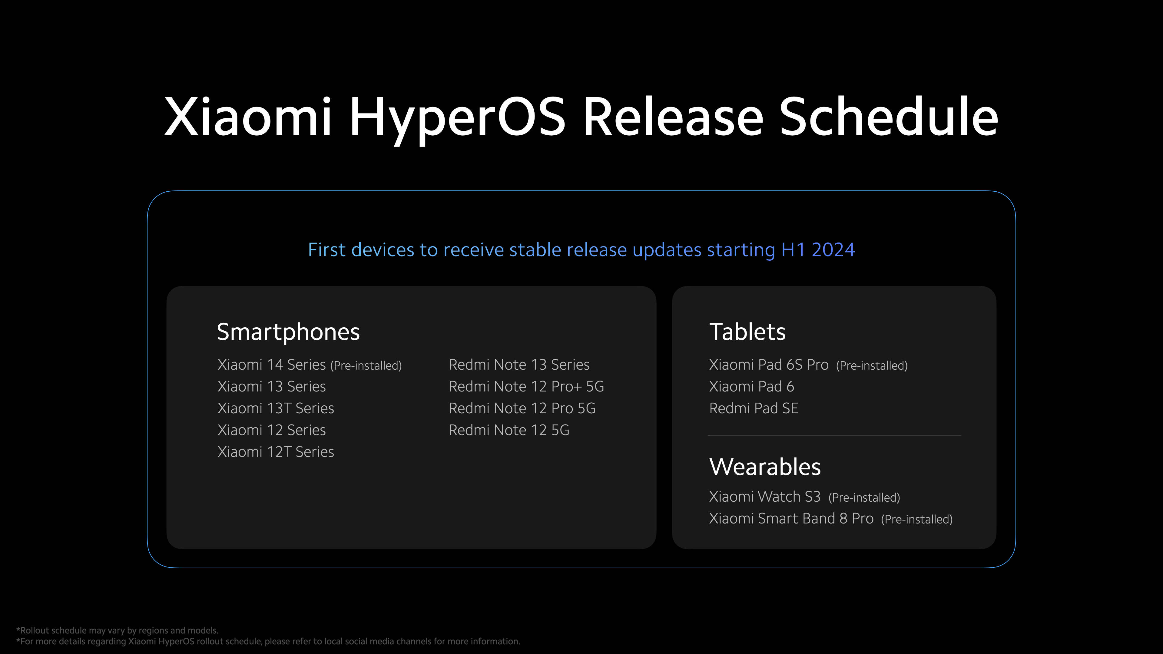 Seznam, zveřejněný v rámci prezentace na MWC, byl 25. února publikován na sociální síti X (dříve Twitter) a dalších platformách. Obsahuje několik řad mobilních telefonů, tři tablety a dvoje hodinky. Na některých zařízeních je přitom HyperOS nainstalovaný z výroby.