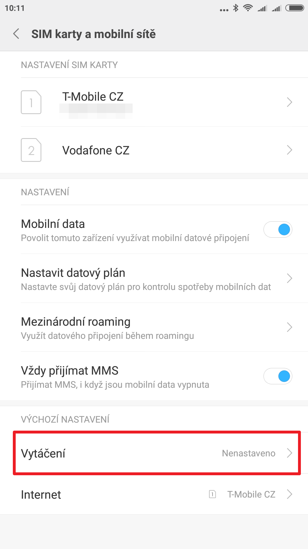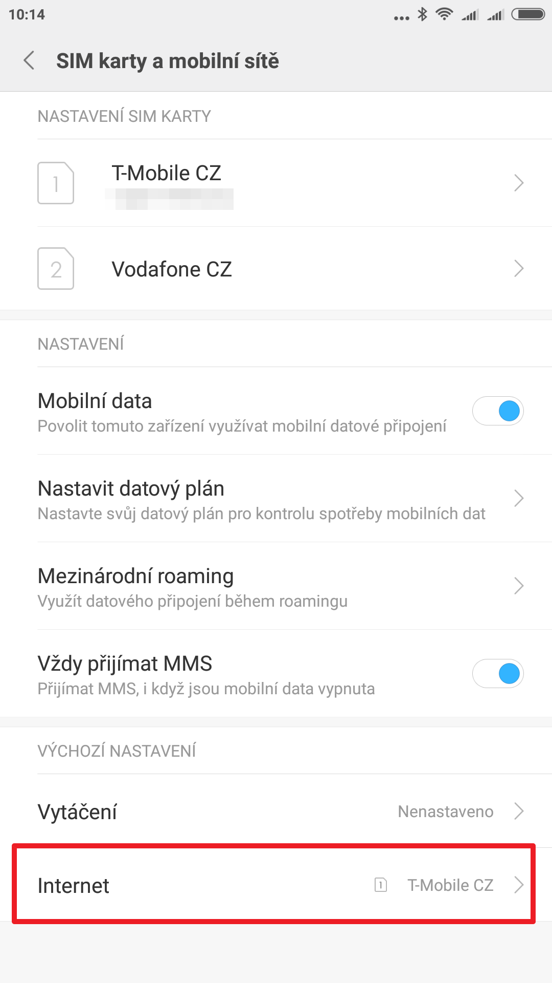 3. V sekci Výchozí nastavení klepněte na Internet a zde zvolte jednu ze SIM.