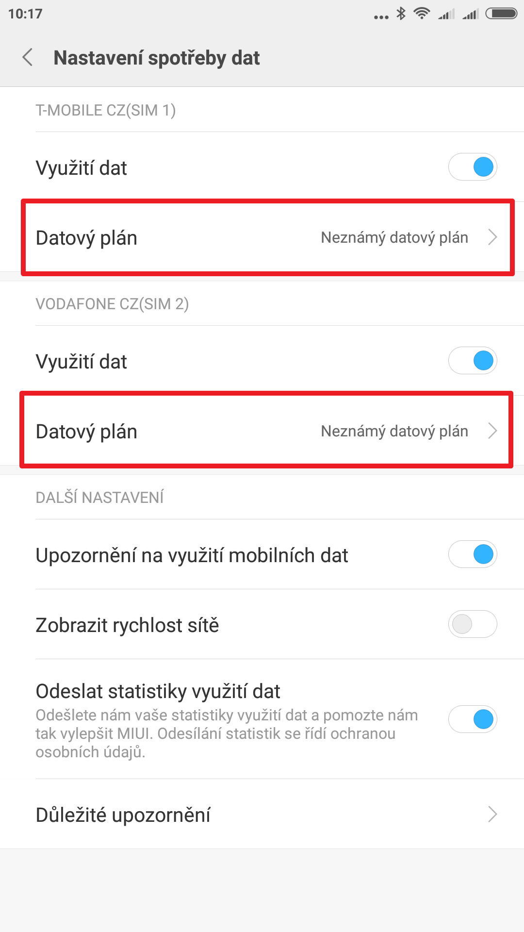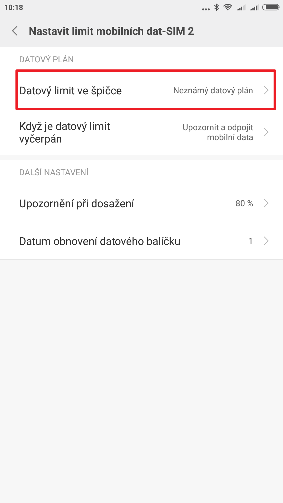 5. V sekci Datový plán u jednotlivých SIM lze nastavit limit, datum obnovení balíčku i stav, při kterém vás telefon upozorní na blížící se dosažení limitu.