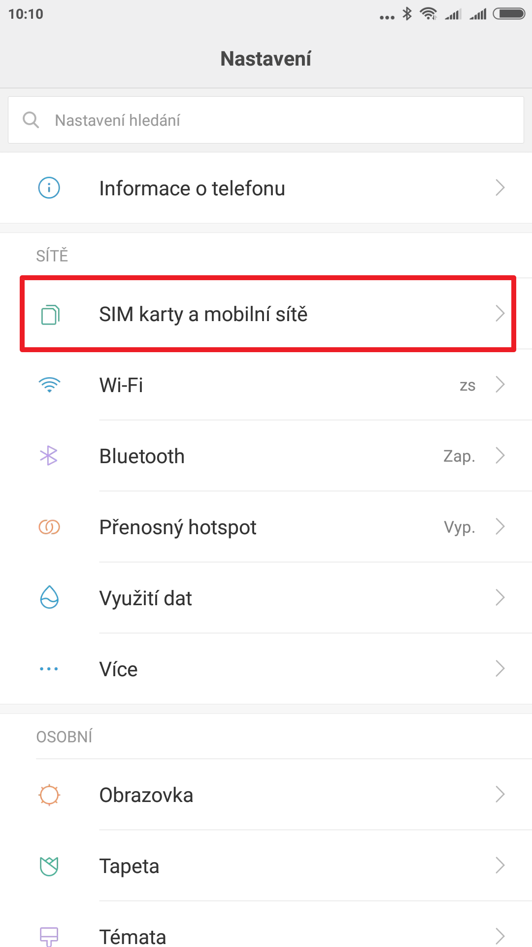 2. Přejděte do sekce SIM karty a mobilní sítě.