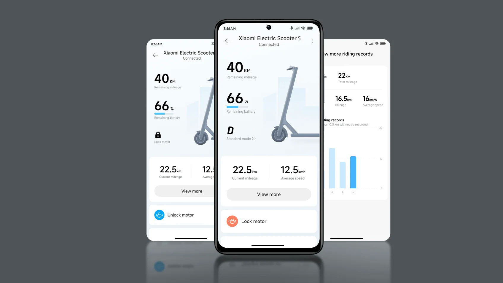 Pro maximální využití potenciálu koloběžek slouží mobilní aplikace Xiaomi Home. Ta nabízí přehled o stavu baterie, možnost uzamčení motoru či nastavení režimu rekuperace energie při brzdění. Nechybí ani možnost aktualizace firmwaru.