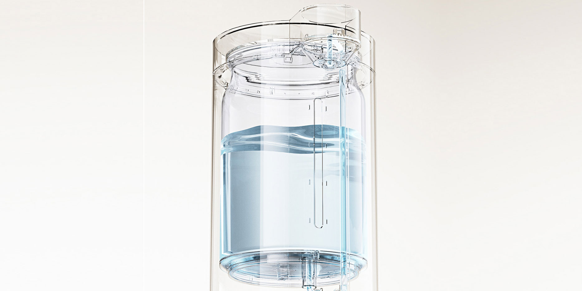 V útrobách se nachází nádrž, schopná pojmout až 5 litrů vody. Je vyrobena ze skla, které je odolné vůči nárazům a je navrženo tak, aby se v případě poškození rozpadlo na malé tupé úlomky, čímž se minimalizuje riziko zranění. Tento materiál je často používán pro výrobu kojeneckých lahví a dalších nádob, které přicházejí do kontaktu s dětmi.