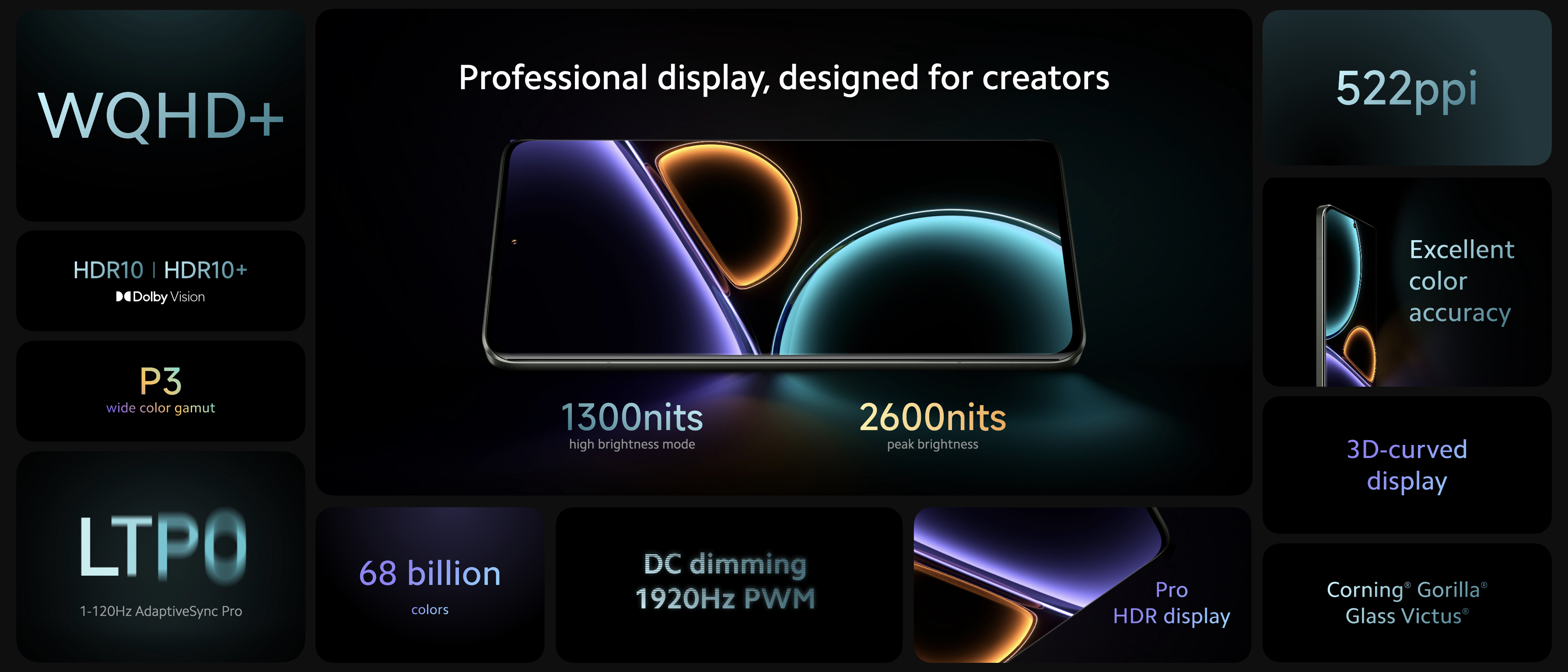 Čínský výrobce naprosto pochopitelně nabízí to nejlepší, co lze v tomto směru pořídit. Obrazovka nabídne maximální jas až 2600 nitů a je schopná maximální obnovovací frekvence až 120 Hz, díky čemuž budou veškeré animace včetně herních naprosto plynulé. Umí automaticky přizpůsobovat obnovovací frekvenci zobrazovanému obsahu, takže například při čtení textu ji dokáže snížit až na 1 Hz, čímž šetří energii. K dalším výhodám obrazovky patří energetická nenáročnost a velmi dobré pozorovací úhly.