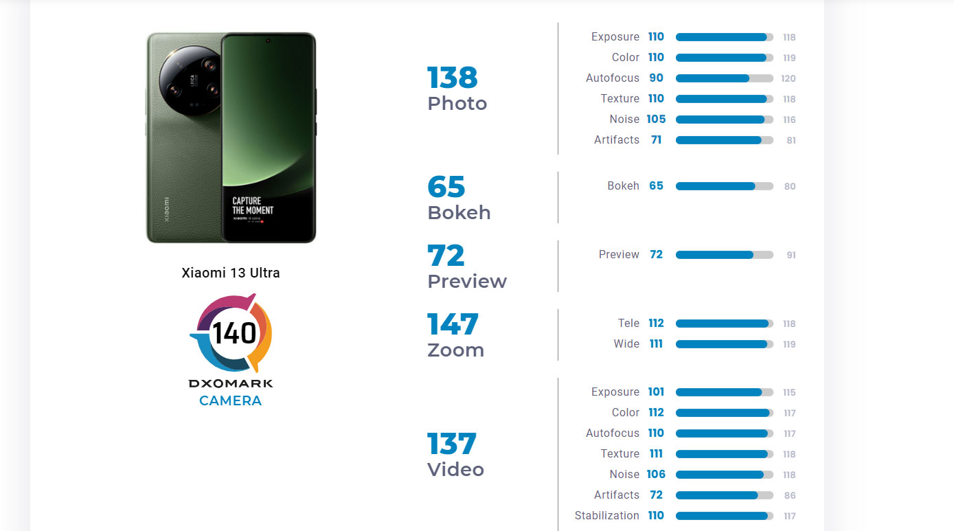 Poněkud překvapivým faktem je skutečnost, že letošní „top“ fotomobil od Xiaomi nedokázal překonat více než dva roky starý model Xiaomi Mi 11 Ultra, který získal o jeden bod víc. Naopak poměrně výrazně přeskočil Xiaomi 13 Pro a Xiaomi 12S Ultra, jež v DxOMarku získaly 136 bodů.