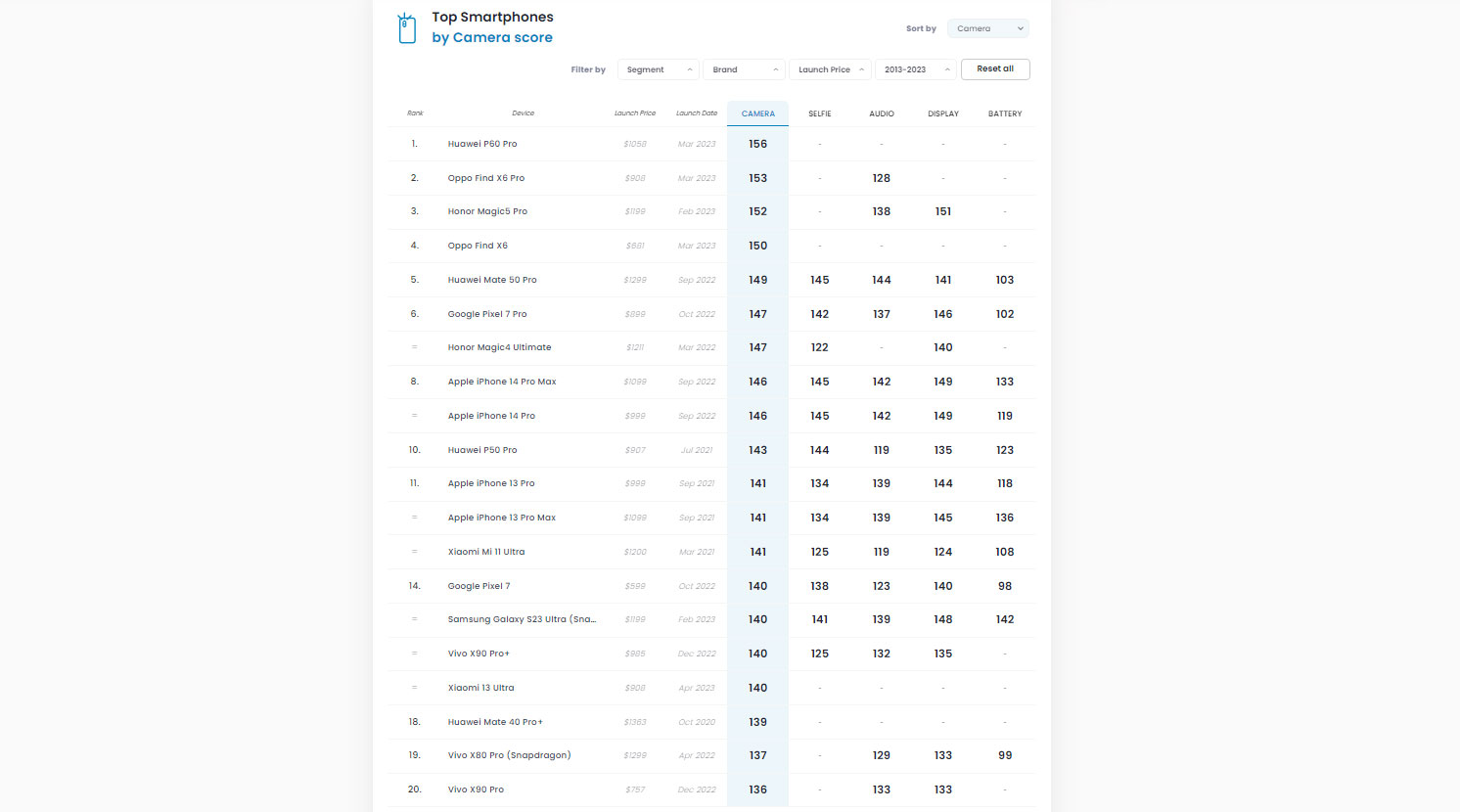 Před Xiaomi 13 Ultra skončila celá řada telefonů pěti značek. V čele žebříčku je aktuálně Huawei P60 Pro se 156 body, následovaný telefonem Oppo Find X6 Pro se 153 body a Honorem Magic5 Pro se 152 body. Lépe než Xiaomi 13 Ultra si vedly také telefony Apple iPhone 14 Pro Max, iPhone 14 Pro, iPhone 13 Pro Max a iPhone 13 Pro.