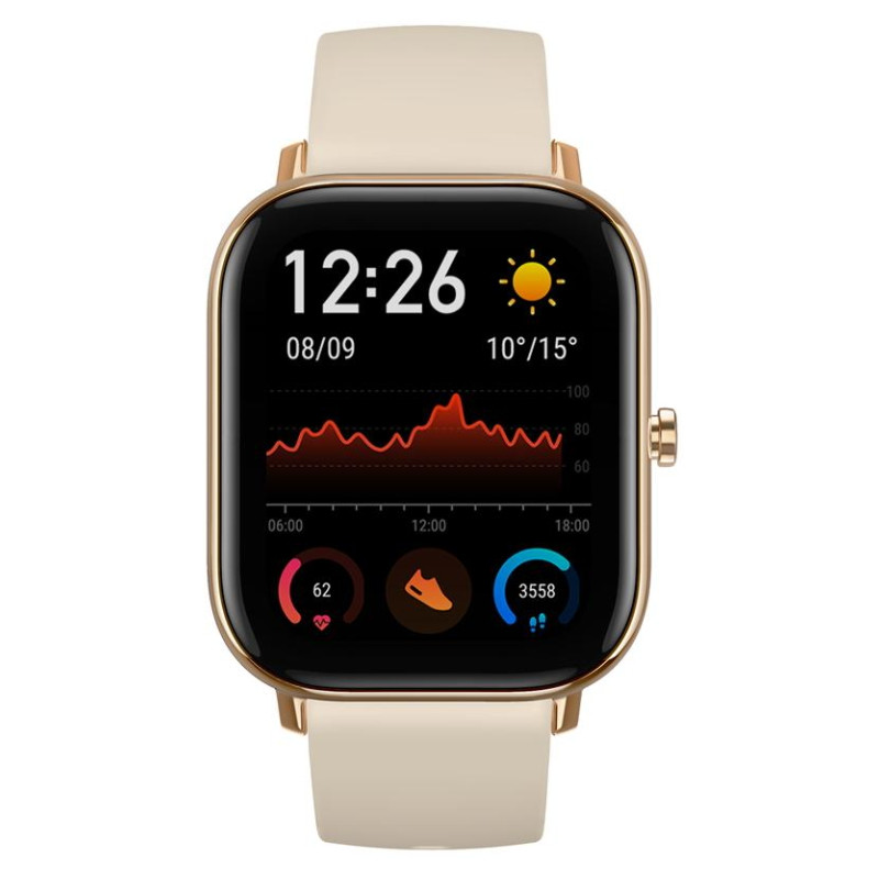 V těle je pak usazen AMOLED displej s úhlopříčkou 1,65″. Ta se může oproti 1,2″, respektive 1,39″ u Amazfit GTR zdát jako velká, nicméně to je skutečně dáno pouze rozdílným tvarem displeje a reálně má uživatel k dispozici přibližně stejnou plochu jako v případě menší varianty s kruhovým displejem. Mimochodem, také dispej Amazfit GTS nabídne skvělou jemnost obrazu. Ta zde konkrétně činí 341 ppi, čehož bylo dosaženo díky rozlišení 348 × 442 px. Velkou pochvalu si zaslouží i velmi dobrá čitelnost displeje na slunci, za což vděčí nejen použité technologii ale rovněž přítomnosti automatické regulace jasu. Displej je pak, stejně jako v případě sourozence s kruhovým displejem, překryt tvrzeným sklem Corning Gorilla Glass 3 – u Xiaomi Huami Amazfit GTS však s výrazným zaoblením po okrajích. Právě zaoblení pak krásně navazuje na zbytek konstrukce pouzdra. To je ve všech dostupných variantách tvořeno hliníkem, jen různě lakovaným.