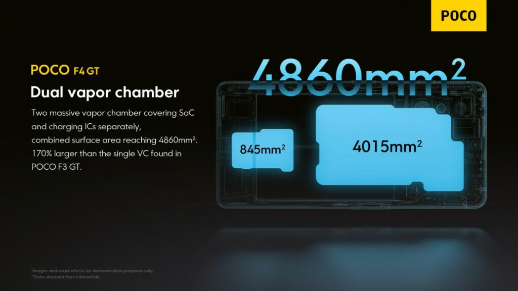 Výkon telefonu dodává jedno z nejlepších možných řešení a sice čipset Qulacomm Snapdragon 8 Gen 1. Snad ani netřeba zmiňovat, že v současnosti neexistuje hra, pro kterou by Poco F4 GT 5G nemělo dostatek výkonu. A osobně si troufám tvrdit, že výkonnostní rezerva je zde natolik velká, že vás tento aspekt nebude muset zajímat dalších pár let. Vysoký výkon však není to jediné, co tvoří kvalitní herní smartphone. S neustále rostoucím výkonem je totiž potřeba věnovat čím dál větší pozornost také chlazení. A Poco se tomuto aspektu evidentně věnovalo. Novinka je tak vybavena hned dvojicí odpařovacích komor. Menší má na starost nabíjecí obvod, zatímco rozměrnější se stará o chlazení čipsetu. A když zmiňuji „rozměrnější“ odpařovací komoru, myslím tím opravdu rozměrnou. Vždyť chlazení pro čipset zabírá plochu 4015 mm².