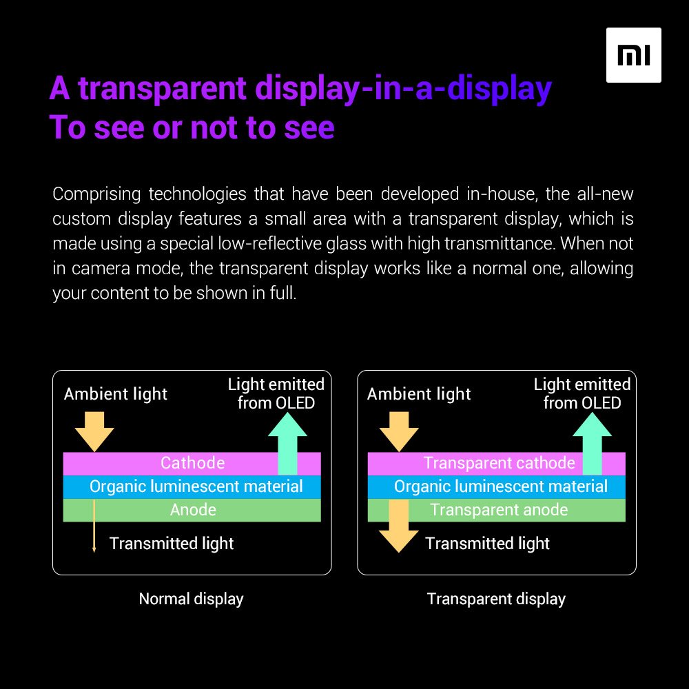 Čínský gigant v tomto řešení používá speciální antireflexní sklo s nízkou odrazivostí a vysokou propustností. To by mělo vyřešit problém s mírným odstínem, který mají průhledné OLED displeje, i když jsou vypnuté, což ovlivňuje kvalitu obrazu. Průhledná část displeje kopíruje svými rozměry a tvarem objektiv fotoaparátu.