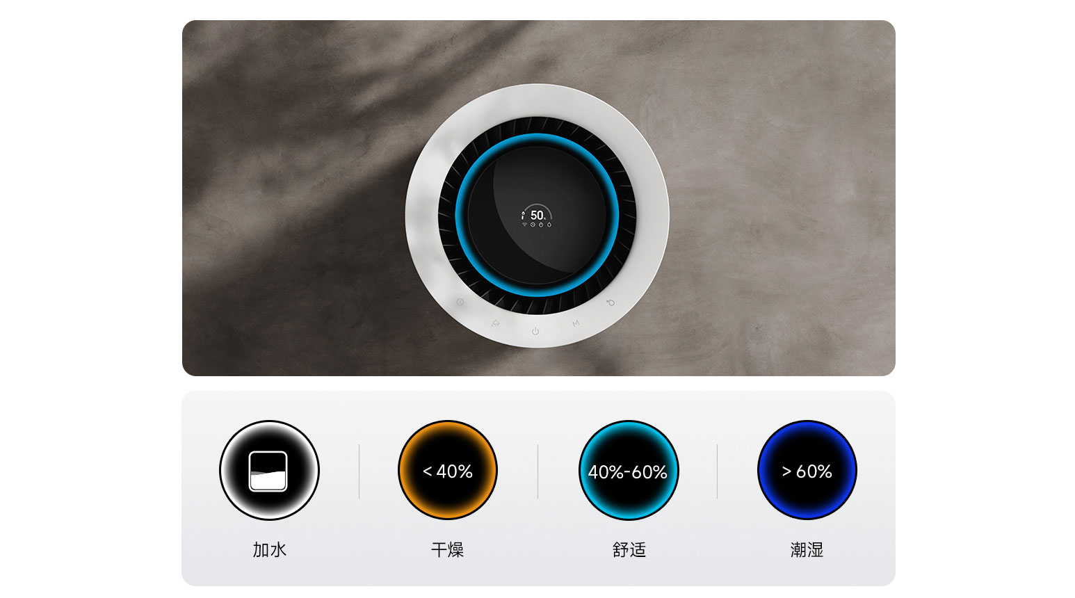 V horní části přístroje se nachází displej, zobrazující údaj o aktuální vlhkosti vzduchu a provozním režimu. Dekorativní barevný LED pásek pak mění barvu podle stavu – pokud svítí bíle, znamená to, že v nádržce došla voda. Oranžová barva značí vlhkost nižší než 40 %, světle modrá optimální rozmezí mezi 40 a 60 % a tmavě modrá příliš vysokou vlhkost nad 60 %.