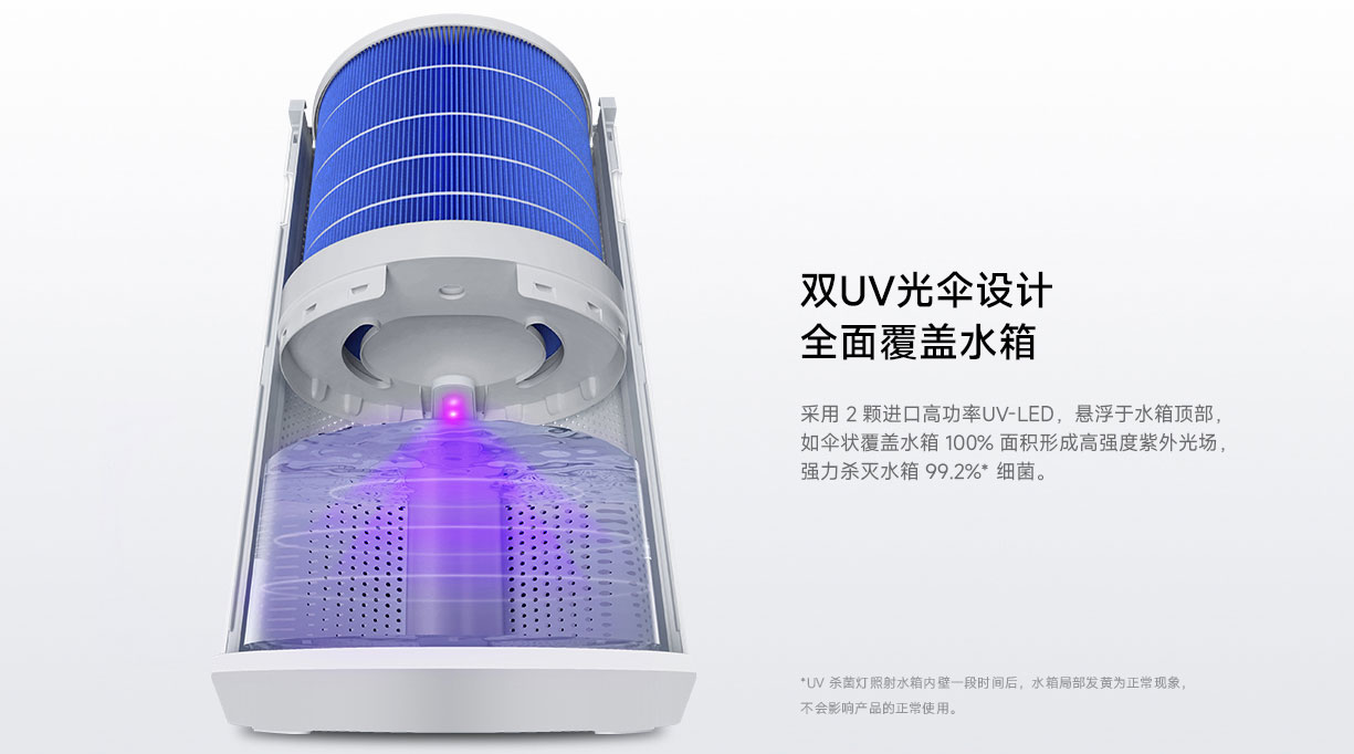 Voda se dolévá shora, takže není nutná žádná složitá manipulace. Udržuje se v nádržce umístěné ve spodní části, kde je dezinfikována ultrafialovým světlem, aby se do vzduchu nedostaly škodlivé mikroorganismy. Výrobce uvádí, že dvě UV lampy dokážou zničit až 99,2 % potenciálně choroboplodných zárodků.