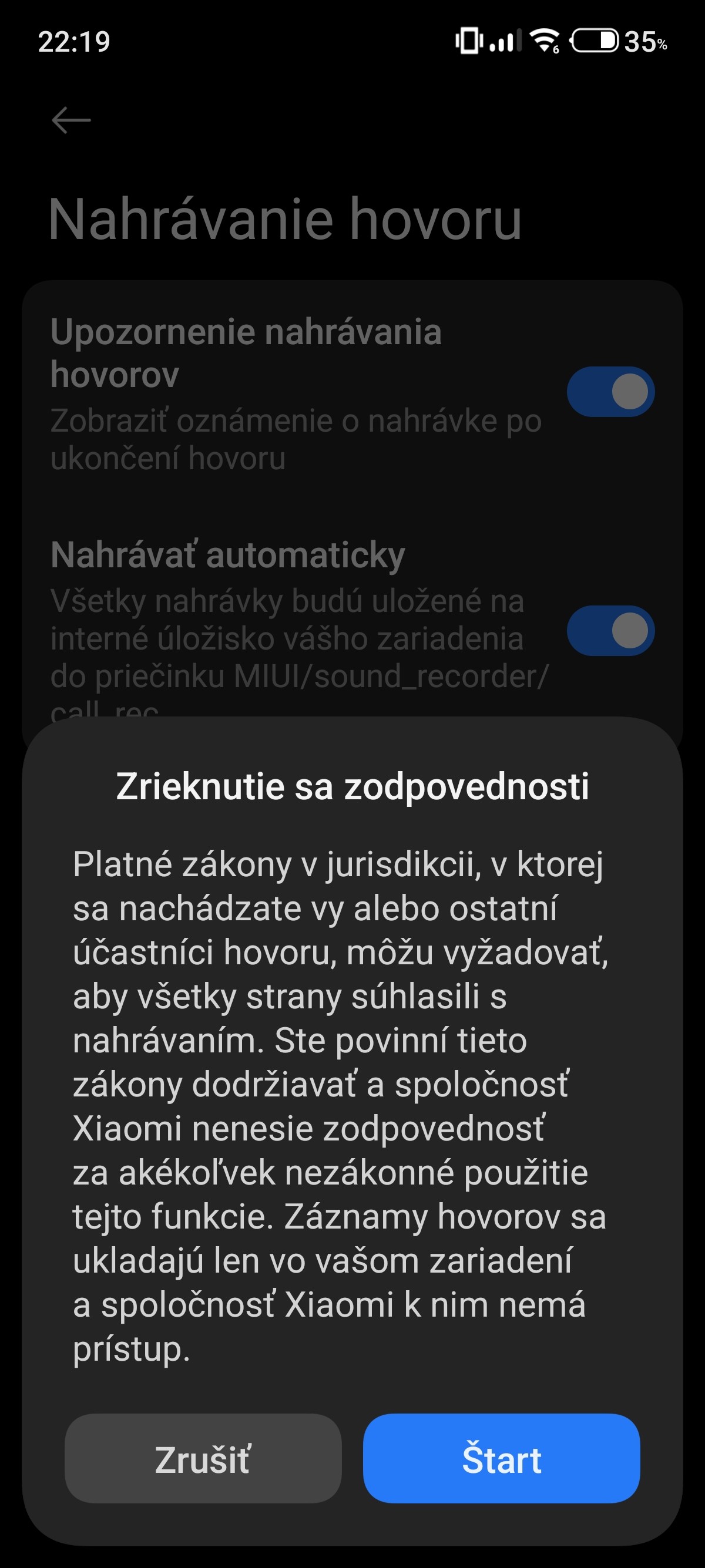 Pri zapnutí automatického nahrávania hovorov naskočí upozornenie, no neukladá nahrávky.