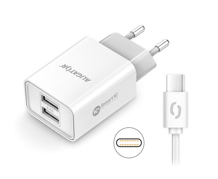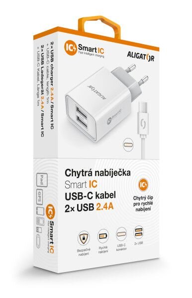 Chytrá síťová nabíječka ALIGATOR 2.4A, 2xUSB, smart IC, bílá, USB-C kabel 2A