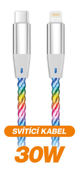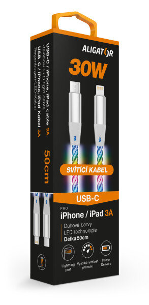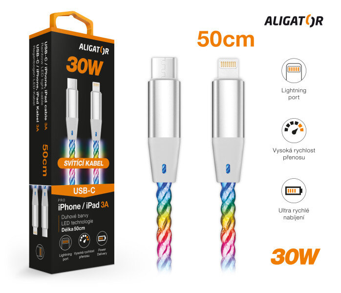 Duhově svítící LED kabel řady ALIGATOR POWER s kovovými konektory USB-C/Lightning nejvyšší kvality, o výkonu 30W a možností nabíjení až 3A.