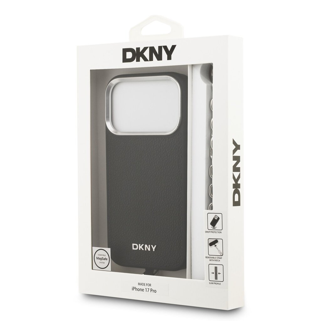 DKNY PU Leather Metal Logo Wrist Chain MagSafe Zadní Kryt pro iPhone 17 Pro Black
