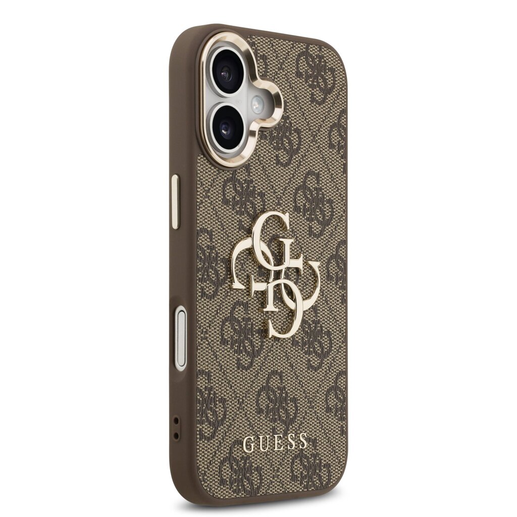 Guess PU Leather 4G Metal Logo Gold Frame Zadní Kryt pro iPhone 17 Brown