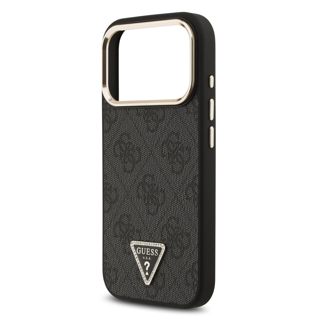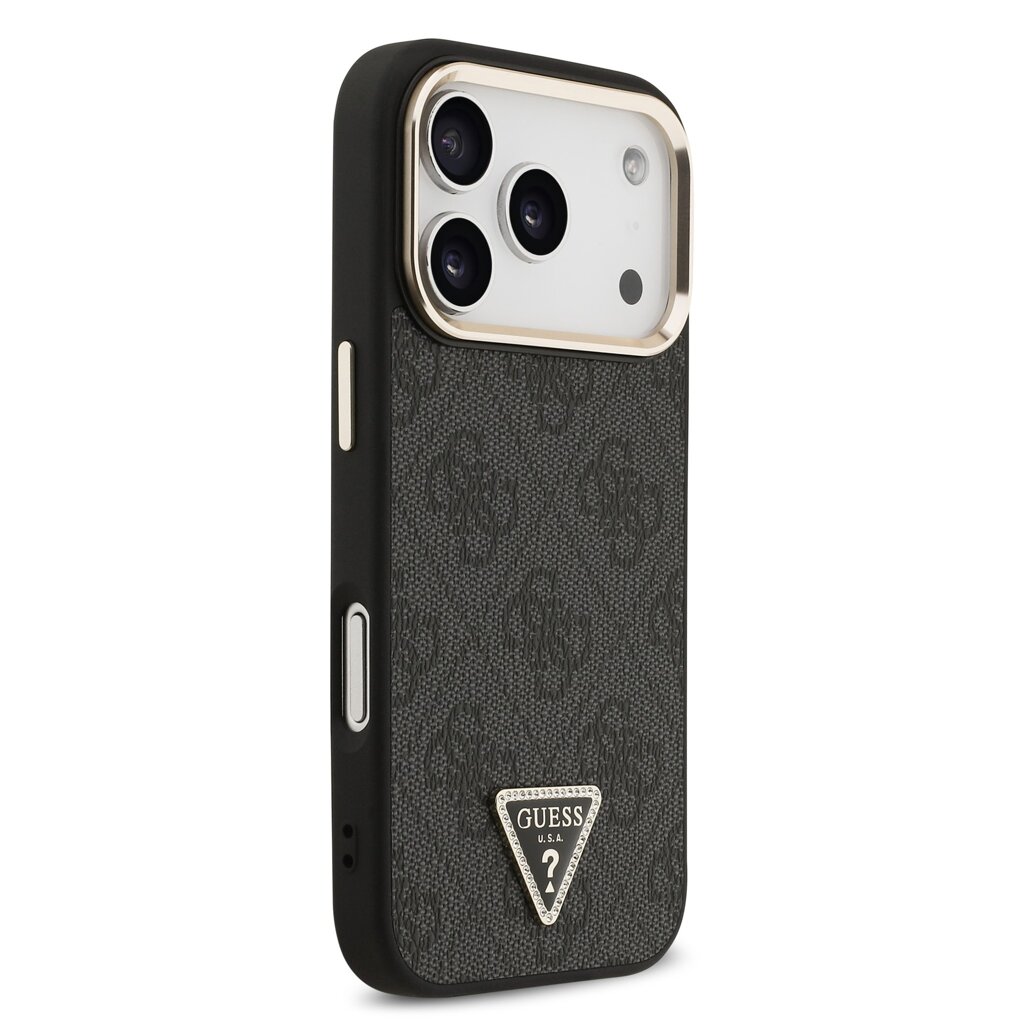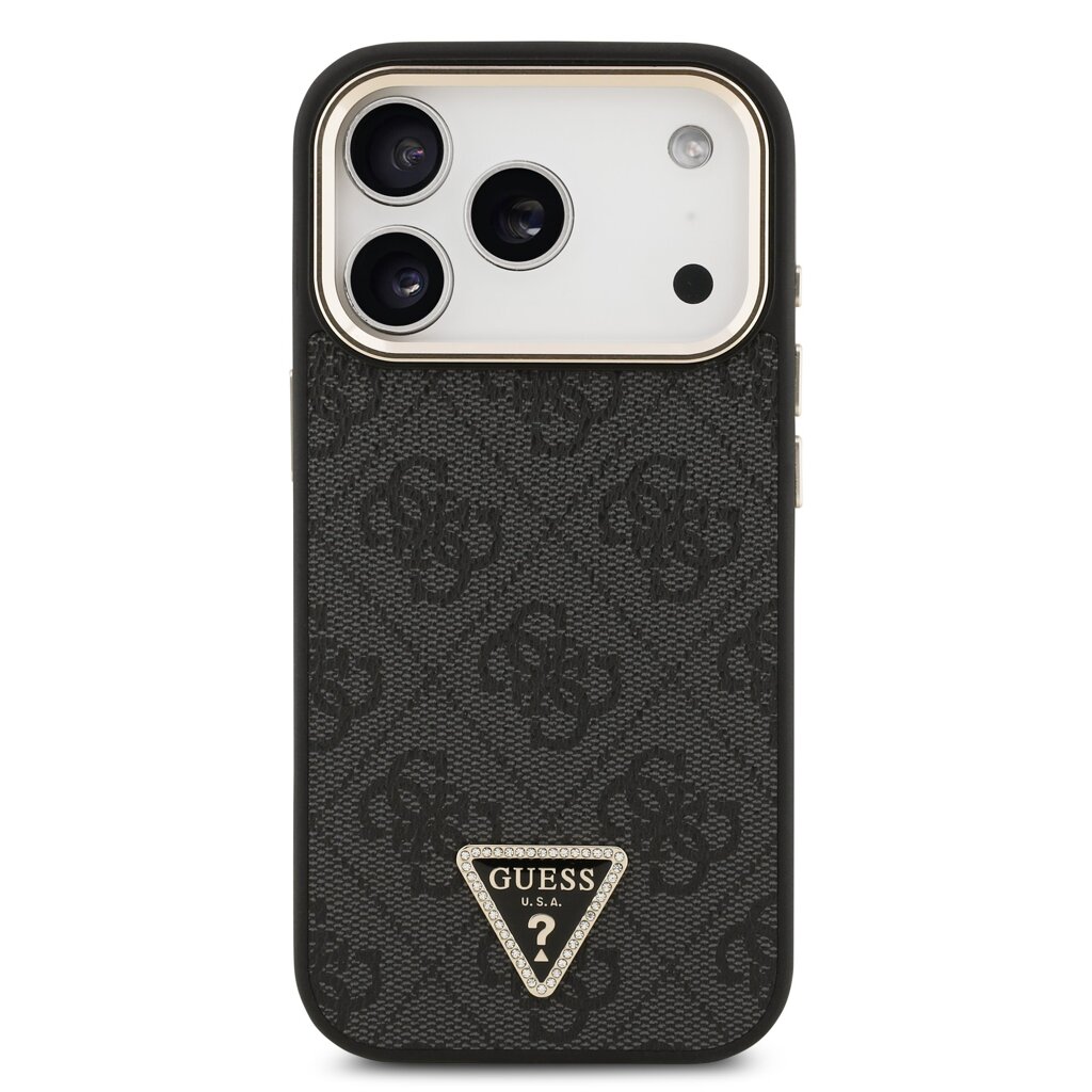 Guess PU Leather 4G Strass Triangle Logo Gold Frame MagSafe Zadní Kryt pro iPhone 17 Pro Black