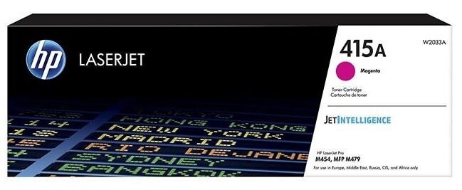 Originální toner HP 415A, HP W2033A, barva purpurová (magenta), výtěžnost 2100 stran. Pro tiskárny HP Color LaserJet Pro M454dn, Color LaserJet Pro M454dw, Color LaserJet Pro MFP M479dw, Color LaserJet Pro MFP M479fdn, Color LaserJet Pro MFP M479fdw, Color LaserJet Pro MFP M479fnw
