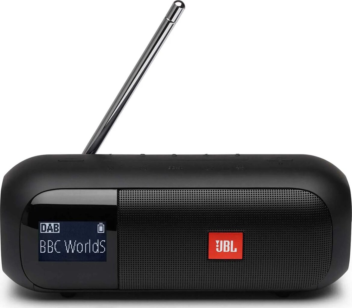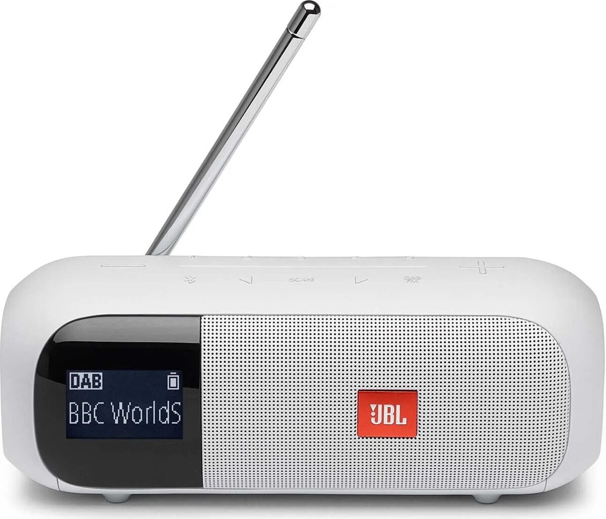 Bluetooth reproduktor JBL Tuner 2 s certifikací odolnosti IPX7 a křišťálově čistým zvukem JBL Pro. DAB / DAB+ / FM, LCD rolovací displej, 5 tlačítek předvoleb, až 12 hodin výdrže, Bluetooth 4.2, doba nabíjení cca 3,5 h, hmotnost pouze 0,54 kg, kompaktní design s elegantními prvky, 5W výstupní výkon.