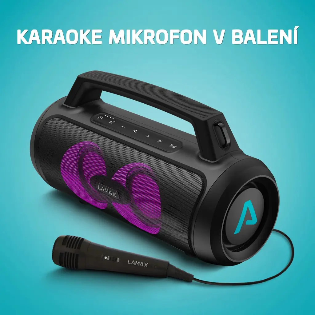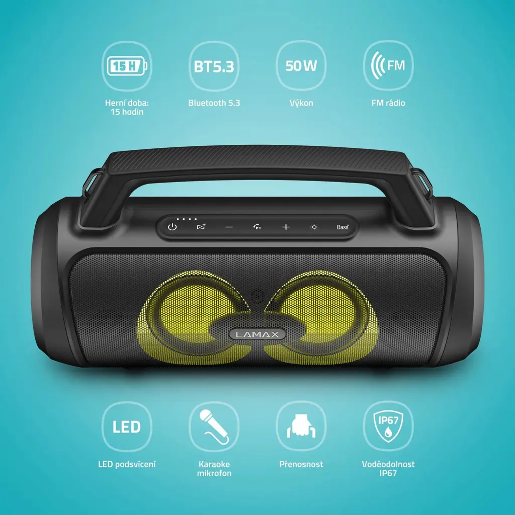 Přenosný party reproduktor LAMAX PartyGo1 Play s šikovným madlem na přenášení a výkonem až 50 W. Technologie BeatBass, 3 režimy LED podsvícení, mikrofon, Bluetooth 5.3 - přenos až 18 m, funkce True Wireless Stereo, FM rádio, podpora hlasových asistentů, indikátor baterie, dobíjení USB-C, výdrž až 15 h.