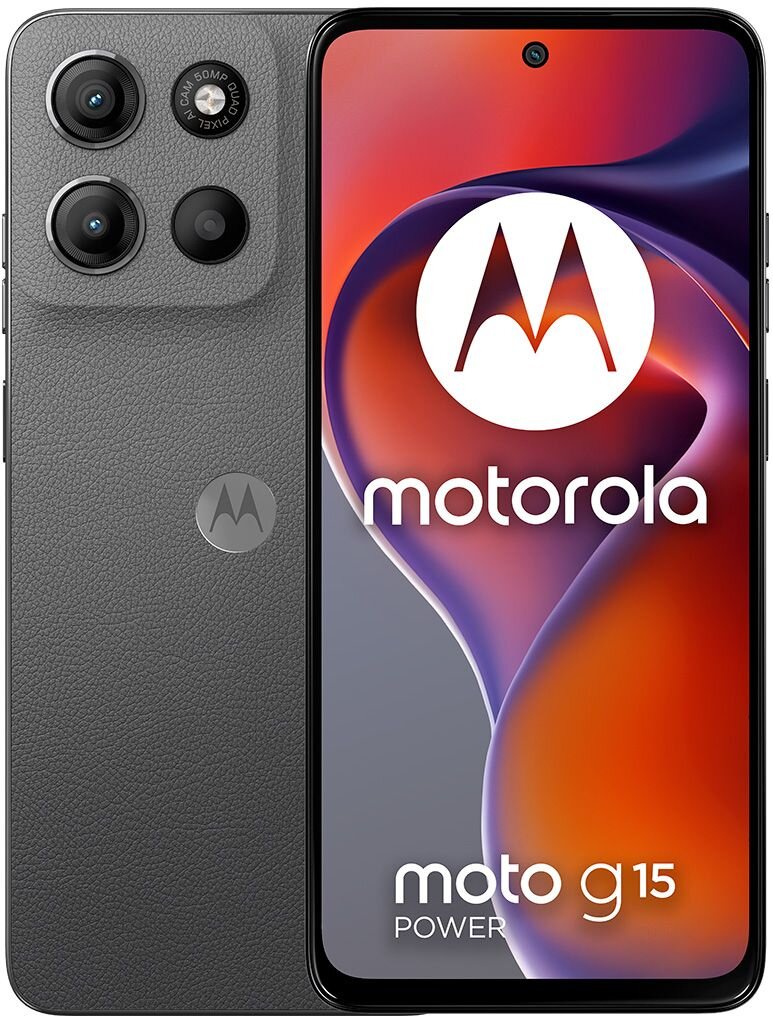 Smartphone Motorola Moto G15 Power Dual SIM s výkonnými stereo reproduktory a technologií Dolby Atmos. 6,72palcový displej Full HD+, 50Mpx fotoaparát Quad Pixel + 8Mpx selfie, 6000mAh baterie, sklíčko Corning Gorilla Glass 3, certifikace IP54, MediaTek Helio G81 Extreme, funkce Optimalizace RAM, microSD až 1 TB.