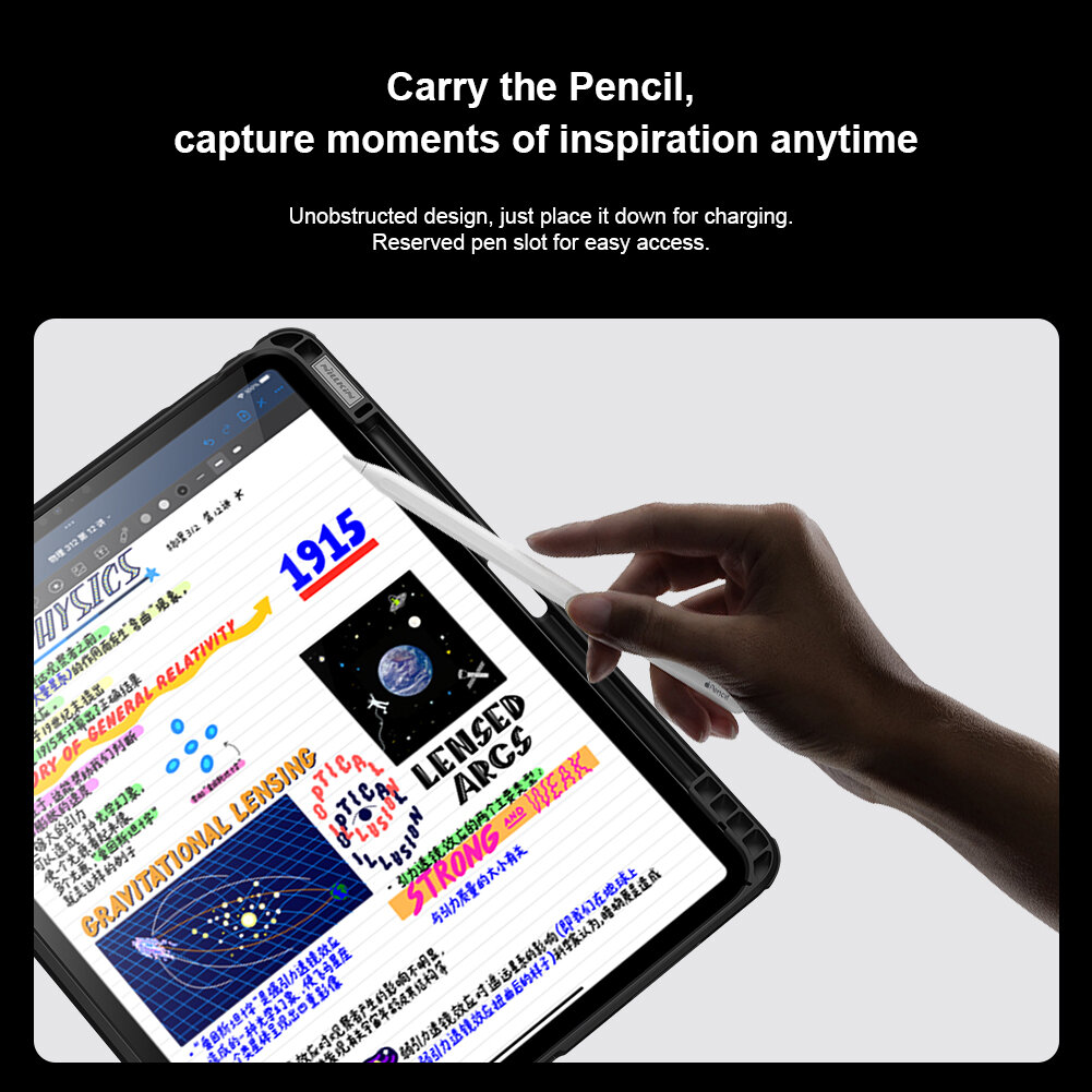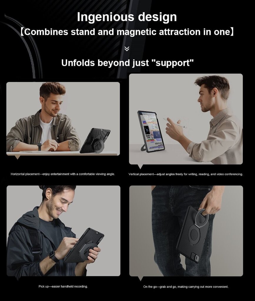 CamShield Pad zadní kryt je multifunkční kryt navržený pro tablety, který spojuje styl, ochranu a praktické funkce do jednoho. Kryt je vyroben z kombinace odolných materiálů TPU a PC, které zajišťují vynikající ochranu proti pádu, poškrábáním, nárazům i ohýbání. Má i posuvný kryt fotoaparátu, který vám ochrání čočky před poškrábáním a nežádoucím prachem. Výklopný stojánek vám umožní pohodlné sledování obrazovky pod různými úhly, což oceníte při práci, zábavě nebo videohovorech. Díky magnetické funkci lze snadno připevnit k dalším magnetickým povrchům nebo příslušenství, což přináší maximální flexibilitu při používání. Kryt má také vyhrazený slot na stylus, který vám zajistí, že ho budete mít vždy po ruce a můžete okamžitě zaznamenat každý moment inspirace. Detaily jako mírně zvýšené okraje proti poškrábání displeje, postranní protiskluzové pruhy pro lepší úchop a citlivá, přesná tlačítka dělají z tohoto krytu ideální ochranu pro váš tablet, připravenou zvládnout každou situaci. Vlastnosti: - Materiál TPU a PC - Posuvný kryt fotoaparátu - Výklopný magnetický stojánek - Slot na stylus - Zvýšené okraje kolem displeje - Protiskluzové pruhy na bocích - Zesílené rohy - Perfektně padne na daný typ tabletu