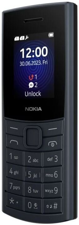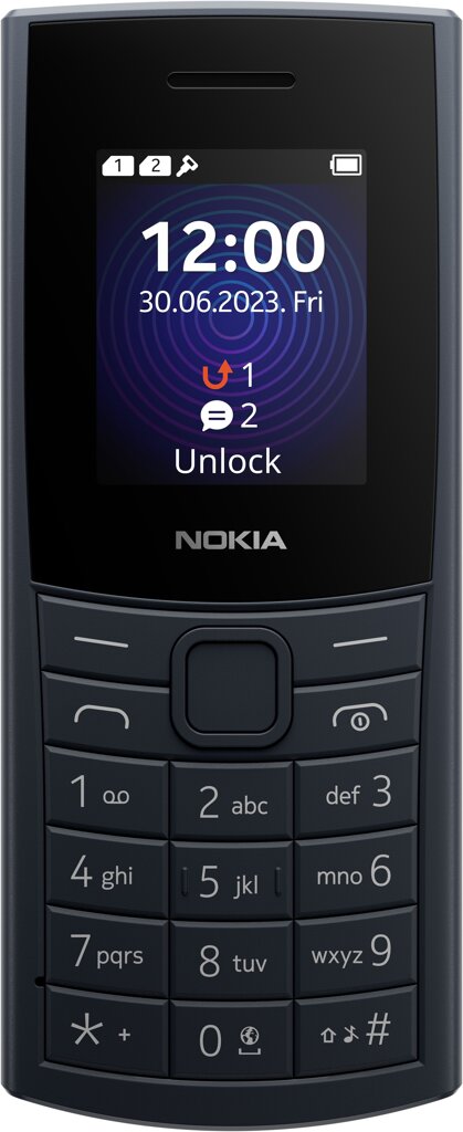 Klasický tlačítkový telefon Nokia 110 4G Dual SIM v modelu roku 2023. 1,8palcový QQVGA displej, zadní kamera QVGA, Bluetooth 5.0, microUSB 2.0, 1450mAh baterie, podpora microSD až 32 GB, operační systém S30+, MP3 prehrávač, mikrofon, reproduktor, sítě: 2G, 3G, 4G. nanoSIM, certifikace odolnosti IP52.