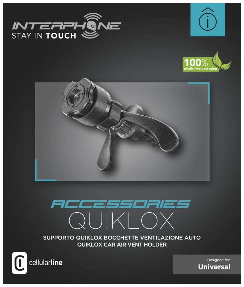 Úchyt Quiklox pro větrací otvory je mimořádně bezpečný, jednoduchý a stabilní. Vhodný pro použití se všemi pouzdry a univerzálními držáky Quiklox. Díky systému s jedním háčkem a dvěma podpěrnými základnami jej lze připevnit ke všem větracím otvorům, standardním i kulatým a umožňuje jejich otevírání a zavírání i odtok vzduchu. Kulový držák umožňuje pohyb úchytu o 90 stupňů v ose Z a otáčení o 360 stupňů kolem základny. Umístění telefonu do nejlepší polohy je tak snadné. Systém Quiklox zabraňuje jakémukoli náhodnému otočení zařízení, pokud na něj není vyvíjen tlak, což minimalizuje jakékoli rozptylování a umožní vám soustředit se na řízení.